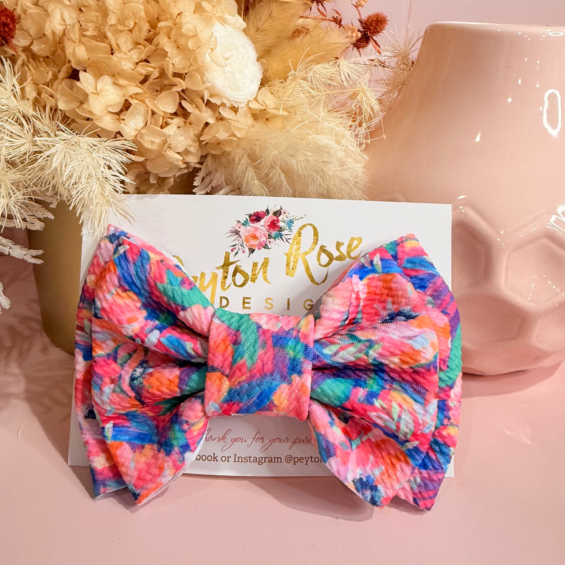 Beautiful soft & stretchy Liverpool bullet fabric made into a double stacked bow. Available on either a soft stretch one size fits all nylon headband or alligator clip.
