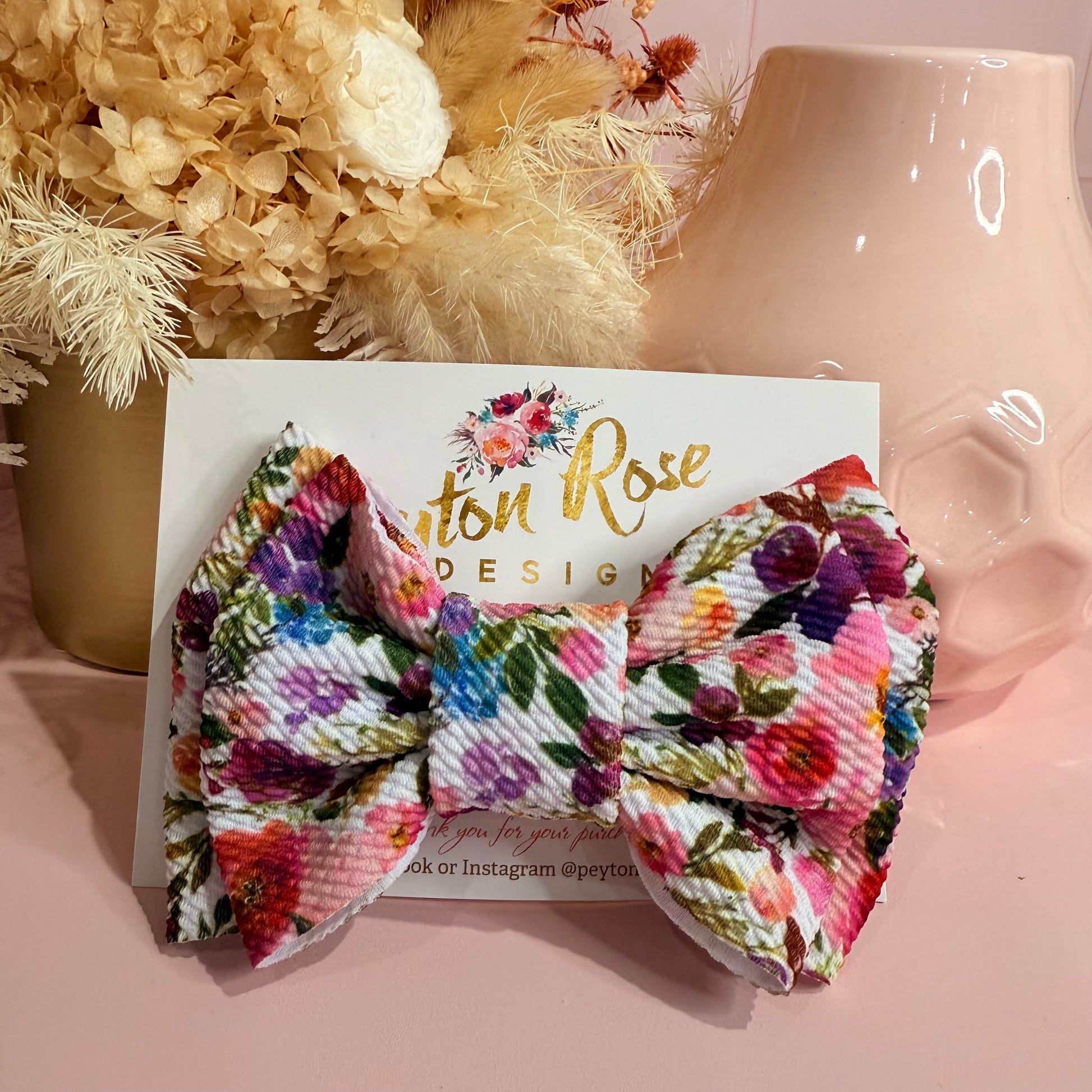 Beautiful soft & stretchy Liverpool bullet fabric made into a double stacked bow. Available on either a soft stretch one size fits all nylon headband or alligator clip.