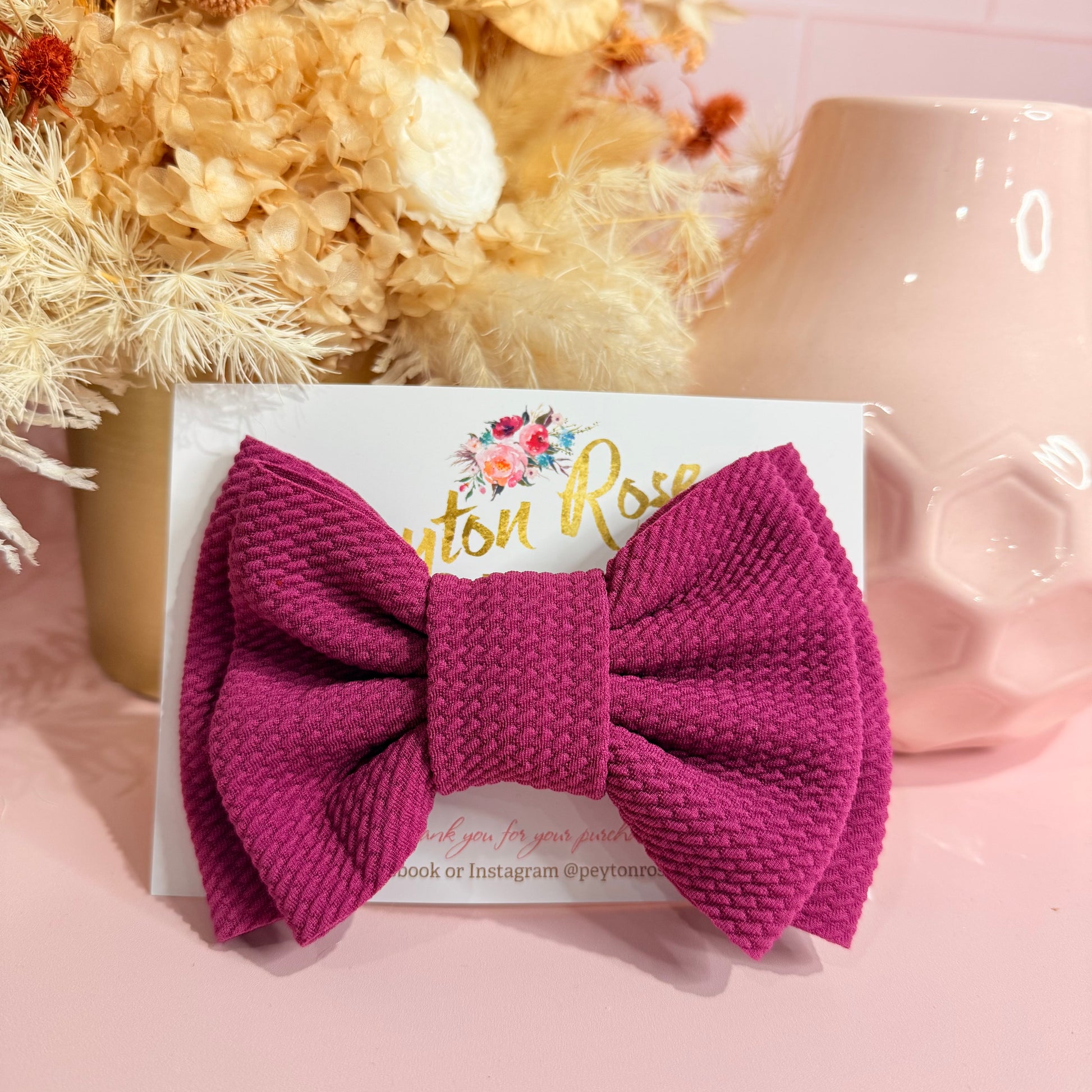 Beautiful soft & stretchy Liverpool bullet fabric made into a double stacked bow. Available on either a soft stretch one size fits all nylon headband or alligator clip.