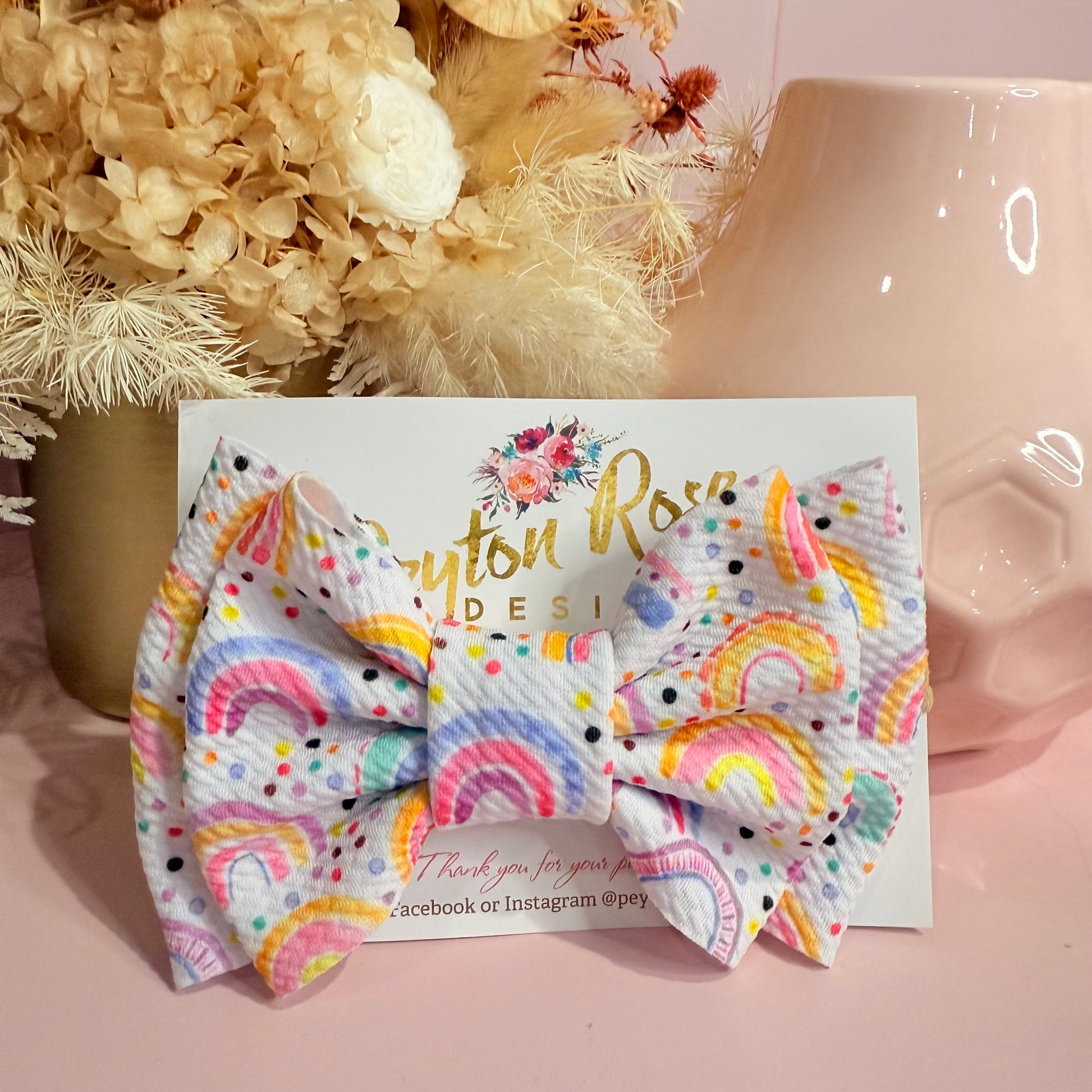 Beautiful soft & stretchy Liverpool bullet fabric made into a double stacked bow. Available on either a soft stretch one size fits all nylon headband or alligator clip.