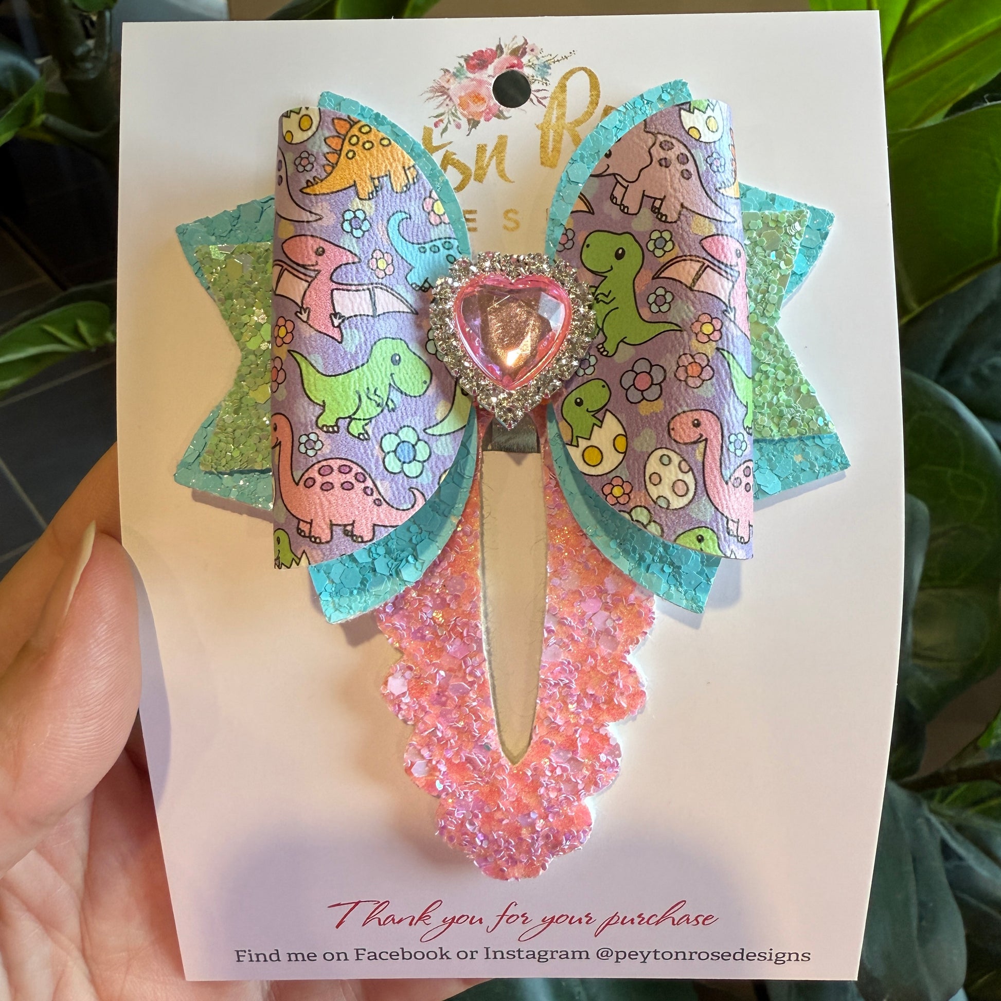 Faux leather/glitter bow on a large snap clip with a lovely soft backing, this beautiful bow is sure to make any outfit pop!